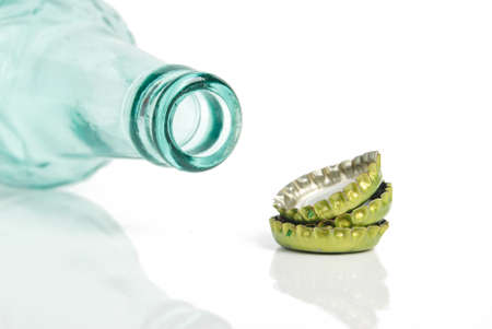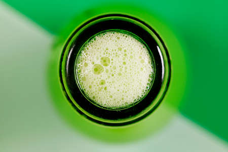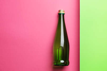 Single green glass beer bottle without label. Full lager bottle with metal cap against green illuminated background. Alcoholic drinks concept.