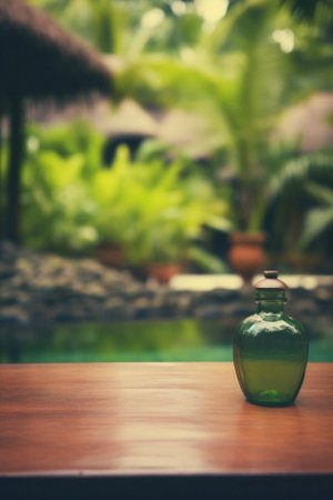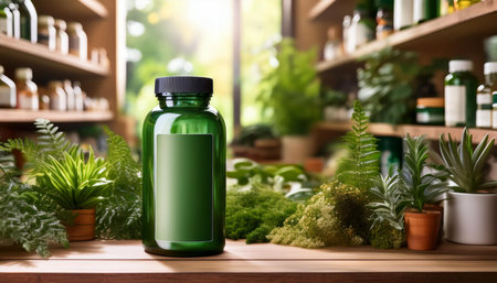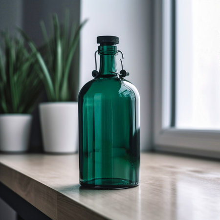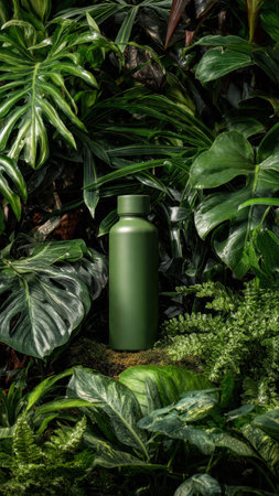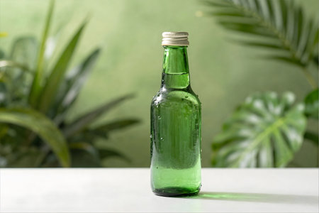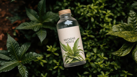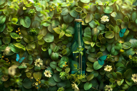 Aerial view of green glass bottles artistically arranged among lush greenery, symbolizing freshness, nature, and eco-friendly living concepts in vibrant settings.