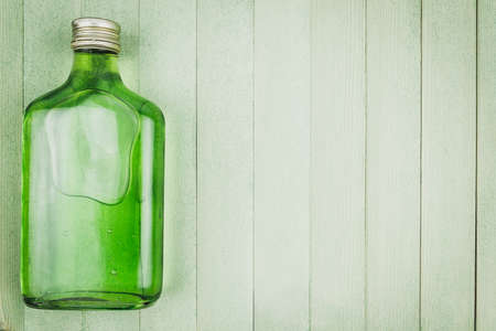 Glass bottle with green absinthe drink on the table. Copy space for text