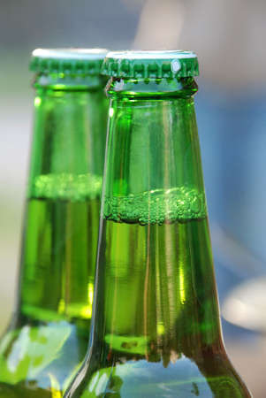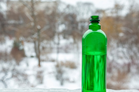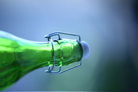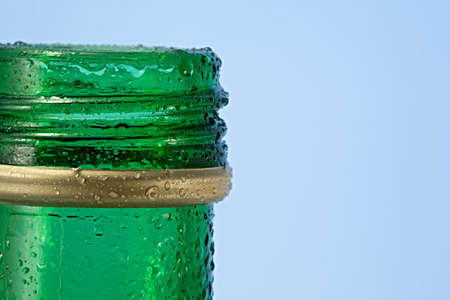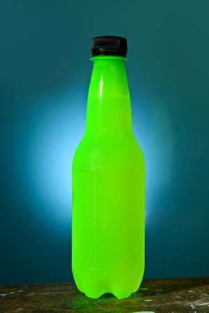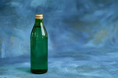 A bottle of green glass with a drink on a blue background with light gilding. copyspace.