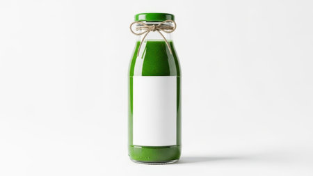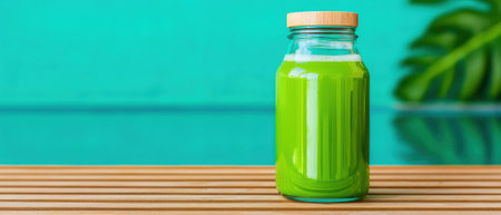 Green juice bottle on wooden surface, vibrant turquoise background.