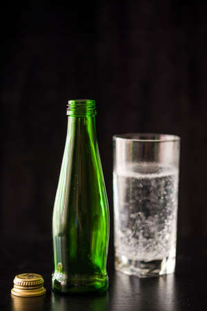 Mineral water in a high glass. Drinking balance. Dark background with a bottle and a glass of water.