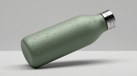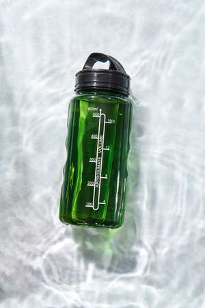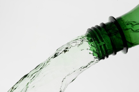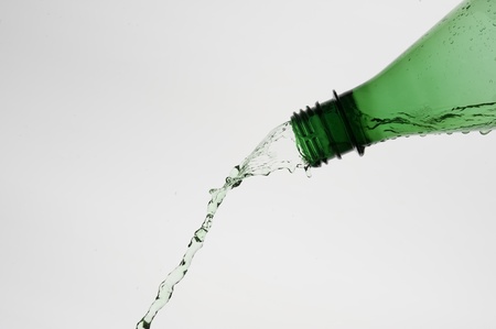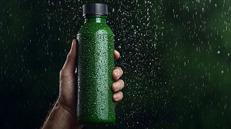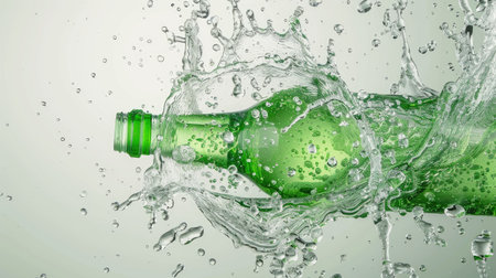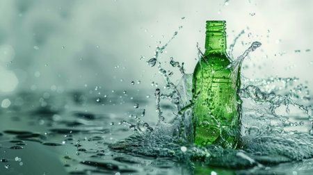 This dynamic image captures a green bottle splashing into water, creating vibrant droplets and a refreshing atmosphere. Perfect for beverage and freshness themes.