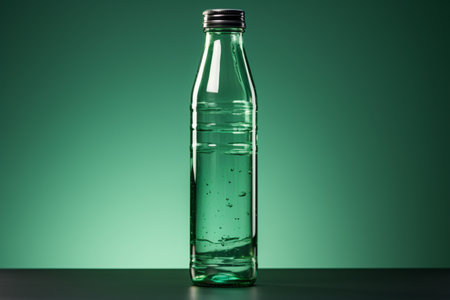A vivid green glass bottle commands attention amid a sea of transparent counterparts, their blurred forms highlighting its distinctiveness on a glossy, mirror-like s