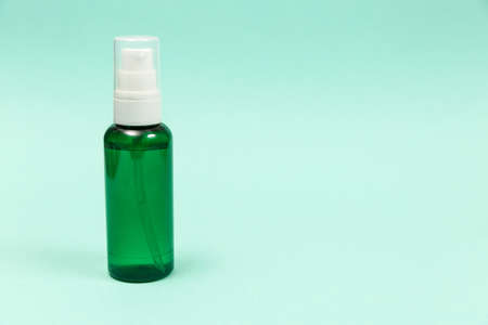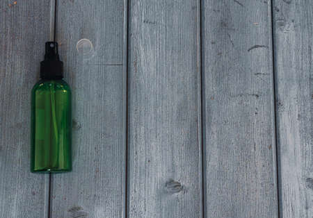 Cosmetic green spray bottle on blue wooden background. natural cosmetic concept. Top view, copy space.