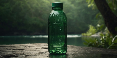 A serene green water bottle rests on a smooth rock by a clear stream, surrounded by vibrant greenery. This image embodies a peaceful connection to nature and sustainability.
