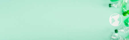 Horizontal crop of paper earth symbol and crumpled plastic bottles on green background with copy space, ecology concept
