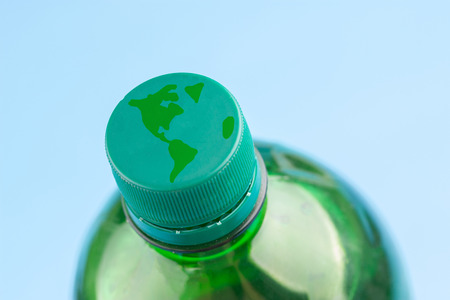 Iced coffee in plastic bottle with green lid on wood table. Concept of a zero waste campaign