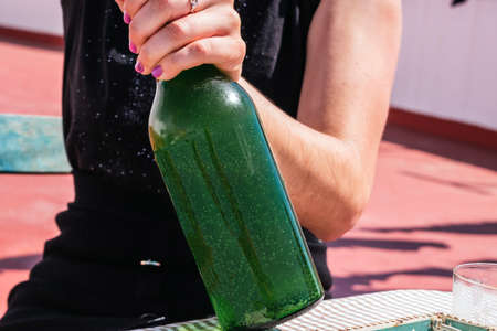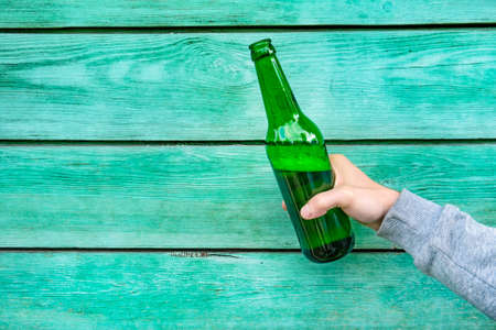 Person hold a Bottle of the Beer on the Green Wooden Wall closeup