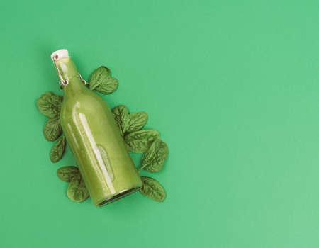 Bottle of spinach juice with spinach leaves on a green background. Copy space.