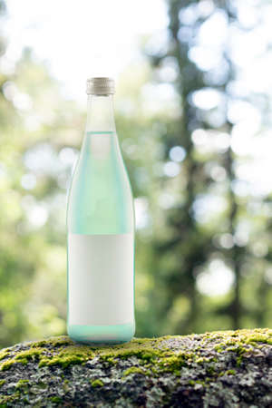 green juice in a glass bottle agave lemonade in the forest, soda water sweet and sour with natural ingredients. Nature is a forest background, a kind of table stone overgrown with green moss. empty mockup label,