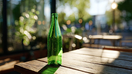A green beer bottle resting on a wooden table, with the sunlight casting soft reflections on the glass, in an outdoor dining setting