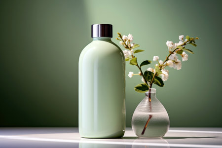Facial cleanser bottle. Lotion or mycelial water for cleansing the face on a white background with harsh shadows from a plant branch. Liquid cosmetic product in green packaging. Natural cosmetics