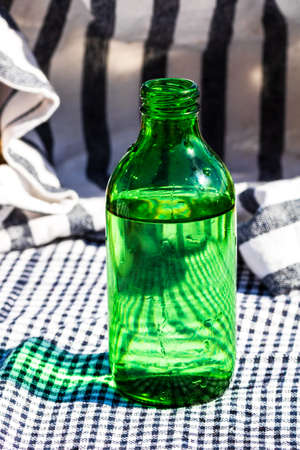 Old-fashioned green transparent glass bottle for medicine, essential oil, empty container with a cork on the white background
