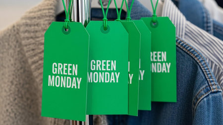 Close-up of clothes hangers with green and blue labels with words Green Monday.