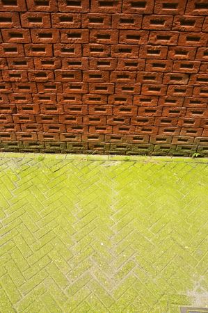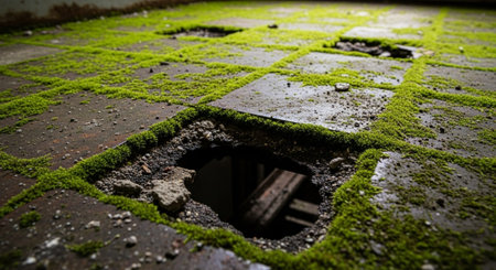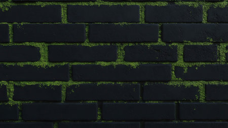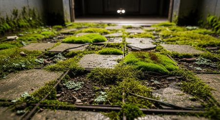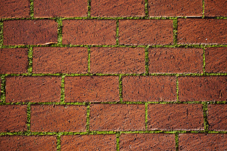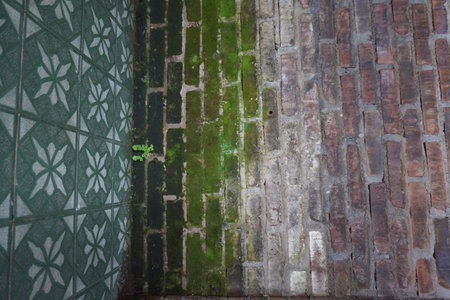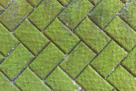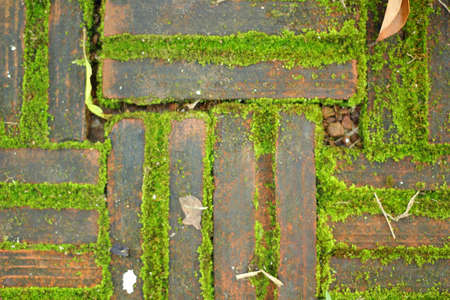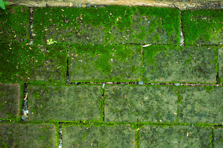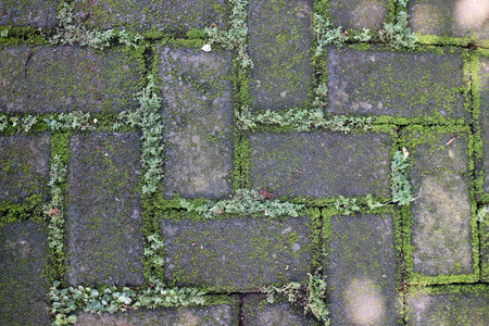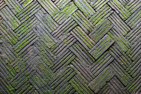 A close up view of a textured brick pathway covered with green moss and small plants, showcasing natures reclamation of urban space.