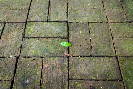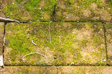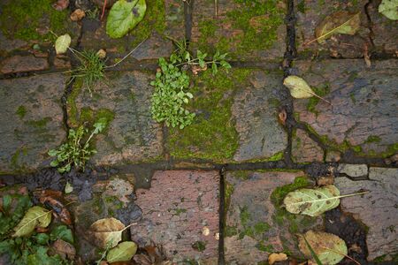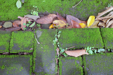 Green moss growing on cracked brick pavement, decorated with colorful fallen leaves creating a natural, vibrant scenery.