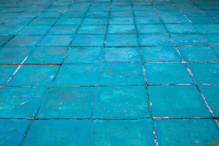 Concrete floor tiles painted aquamarine or turqoise in a diminishing perspective