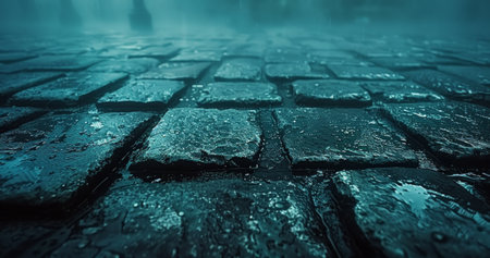low angle view of wet cobblestones in a city, with a thick fog rolling in, creating an atmospheric and eerie scene.