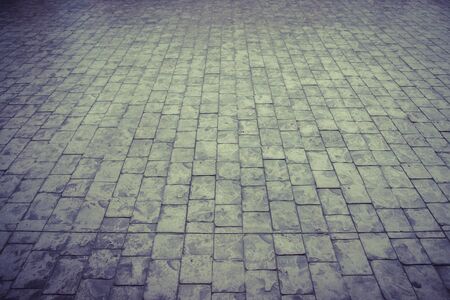 Photo on top of the road paved with sidewalk tiles. Empty background with vignette, texture of masonry