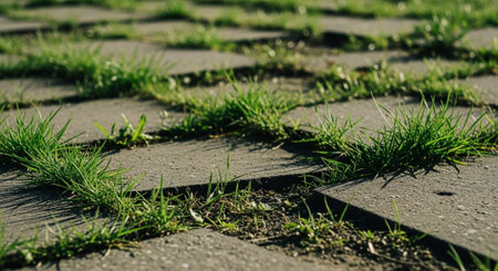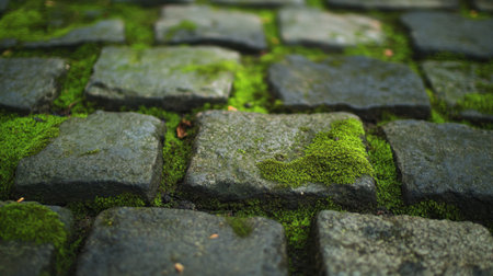 Close-up of pavement stones with green moss growing in between, illustrating the beauty of nature reclaiming urban spaces.
