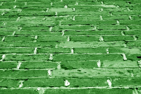 Brick wall texture in sunny day close-up. Abstract background green color toned