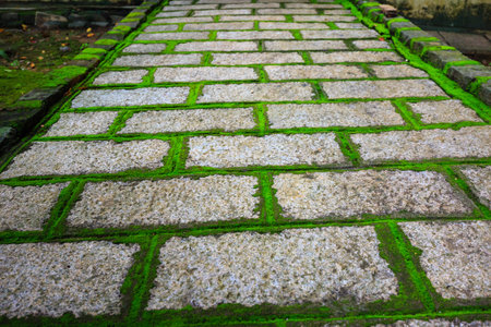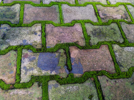 A close up view of a stone pavement with moss and small plants growing in the cracks between the stones. The pattern is geometric, showcasing a mix of gray stones and vibrant green moss.