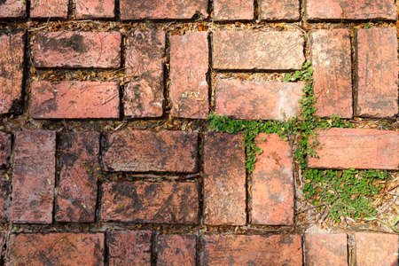 Close-up of a brick pavement with small green plants growing between the bricks. The bricks are different colors and textures, and sunlight is illuminating the scene.
