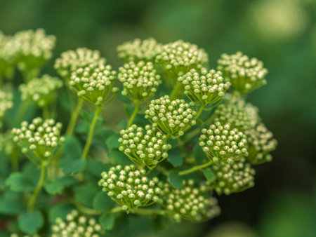 Spiraea chamaedryfolia or germander meadowsweet or elm-leaved spirea white flowers with green background. Magnificent shrub Spiraea chamaedryfolia
