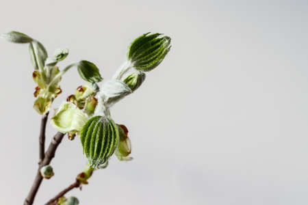 Green buds on branches in spring, close up. Nature and blooming in spring time. Bokeh light background.