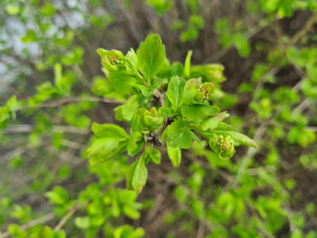 Branches of bush blooming in beauty spring forest. Fine feeling in calm garden. Relax atmosphere for meditation. Green branches of small bush. Beautiful nature in spring.