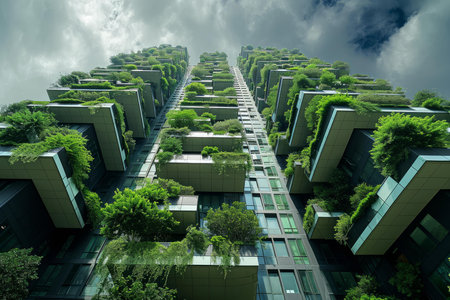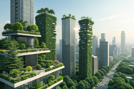Environmentally friendly green city architecture skyscraper design urban planning nature leaves trees plants oxygen producing vertical garden eco-aware buildings tall modern town buildings