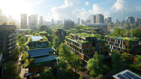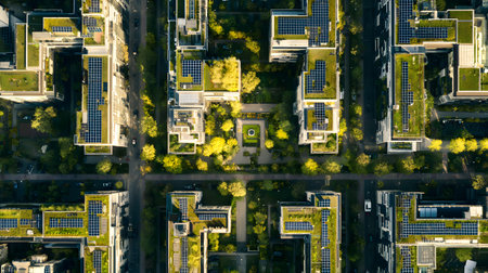 Aerial view of a smart city district with green rooftops and solar panels. urban planning and nature integration, golden hour