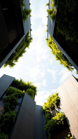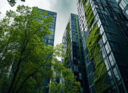 Discover a striking modern building facade adorned with lush greenery. This urban architectural marvel showcases the beauty of sustainability and nature integration.