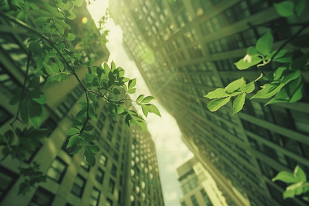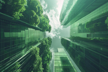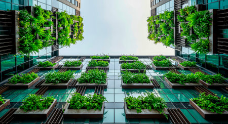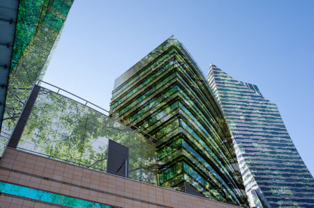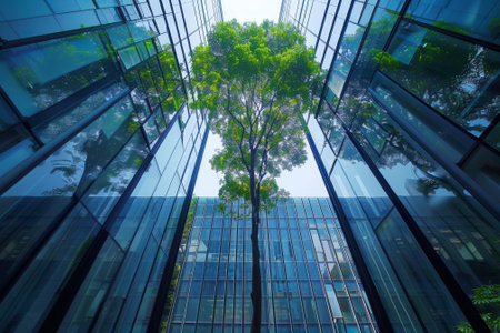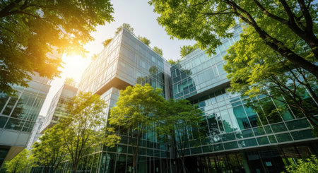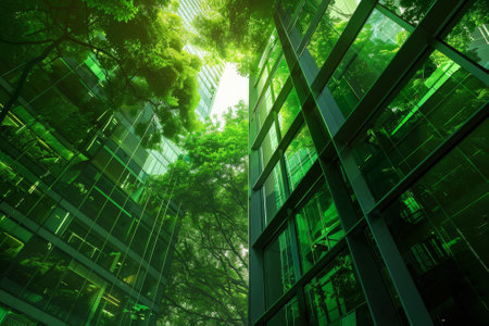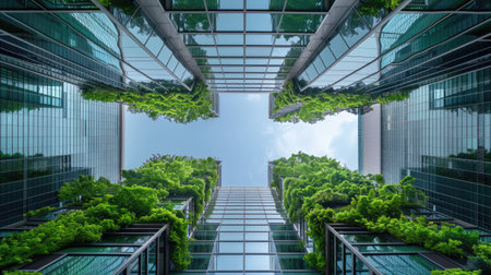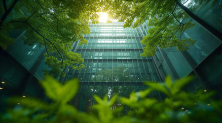 look up perspective of green trees and plants by modern glass skyscraper office building, nature and contemporary architecture, balance and harmony of environment and human, sustainable ecosystem. High quality photo
