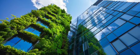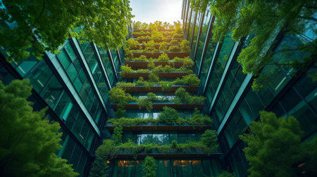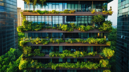 Eco-friendly building with lush greenery in sustainable urban area. Modern city architecture