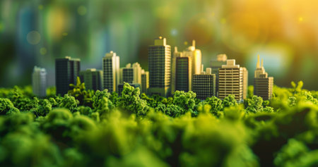 Miniature cityscape featuring skyscrapers and greenery, symbolizing urban sustainability and nature
