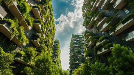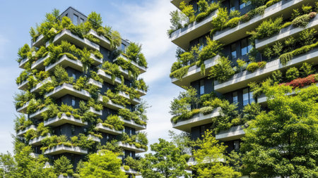 Vertical forest residential towers rising in Milan, featuring lush greenery cascading across concrete surfaces, embodying sustainable urban architectural design principles. Innovative architecture
