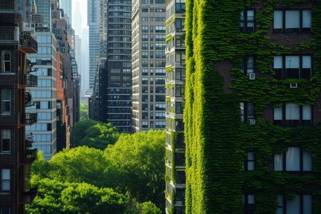 A group of tall buildings embraced by green plants, creating an urban jungle in the heart of the city.
