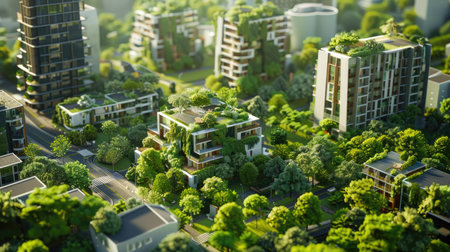 Detailed 3D model of a city with green buildings and trees, highlighting urban sustainability with this inviting photo.