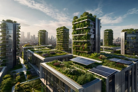Green initiatives such as rooftop gardens, vertical farms, and eco-friendly buildings promoting sustainability and environmental stewardship