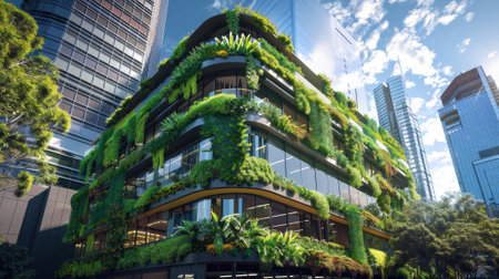 A striking modern office building featuring extensive greenery and glass elements. This eco-friendly design showcases sustainable architecture in an urban setting.