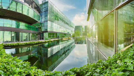 A panoramic view of a modern sustainable office building featuring eco-friendly green architecture, innovative design, glass facades, and AI-driven smart workspace solutions in a vibrant urban