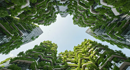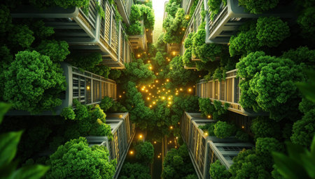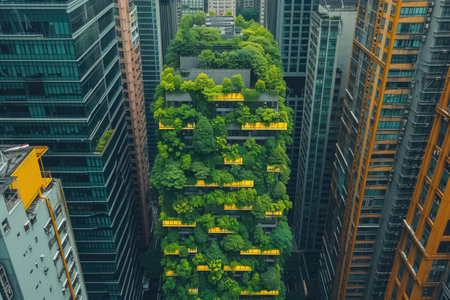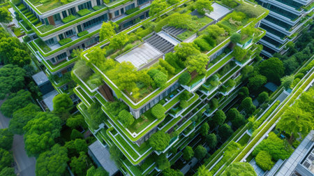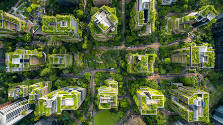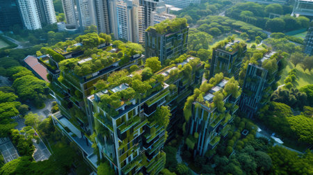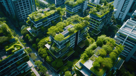 Stunning aerial view showcasing modern urban buildings entwined with lush greenery, highlighting the harmonious blend of architecture and nature in city life.