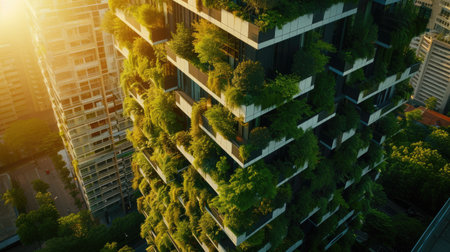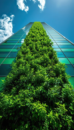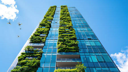 A modern skyscraper adorned with lush greenery, blending innovative architecture with sustainable urban design. The building stands tall in the cityscape, showcasing eco-friendly construction.