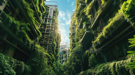 A modern architecture marvel featuring lush greenery, vibrant plants, and sustainable design principles, set in an urban landscape, promoting harmony with nature.