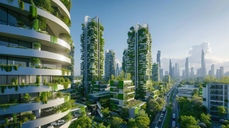 A Modern Urban Landscape with Lush Greenery, Skyscrapers, and Sustainable Living Features