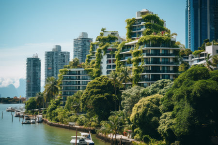 Modern eco-friendly skyscraper featuring lush green vegetation on balconies, highlighting sustainable and innovative architecture. Promotes urban greenery and environmental consciousness.