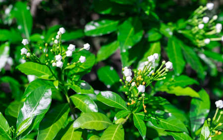 Tabernaemontana pandacaqui Lam. Close up view and shade of white flowers in the garden.