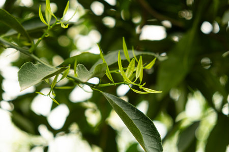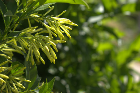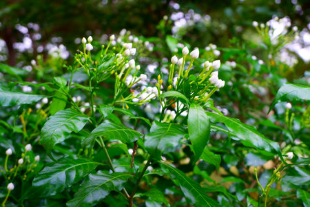 Murraya paniculata cluster of small, green buds is nestled among lush green leaves. Bathed in soft sunlight
